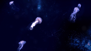 海流导致鱼群横行,大鲸鱼在大海上悠闲地觅食,水母飘逸地游动着,散发着光芒,各种生物一起展示着大海下的日常生活。